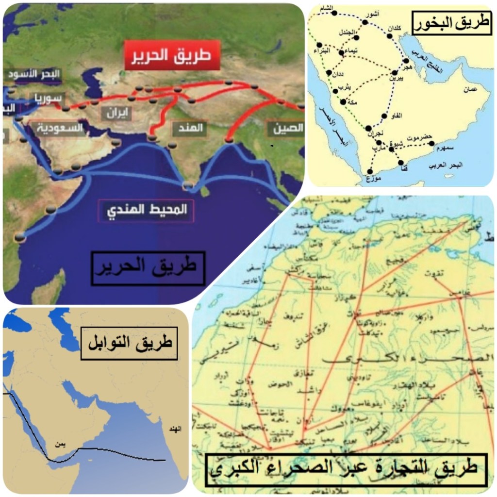 طريق التوابل (لفلفل والقرنفل والقرفة وجوزة الطيب ..). التي تبدأ من الهند، وكان التجار يتداولون بها إلى أن تصل إلى الموانئ والمرافئ البحرية أو عبر الطرق البرية. كان التجار العرب معروفين بهذه التجارة وازدهرت عدة مدن عربية عبر هذه الطريق التجارية