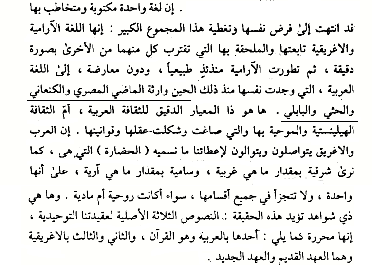 “ثم إننا لا نعتقد أن الآرامية هي أقدم اللغات السامية كما زعم قوم، وأقل من ذلك أنها أقدم لغات العالم كما زعم غيرهم بلا بينة ولا أساس. بل نثبت مع العلماء المحققين أن اللغة العربية هي التي تقرب إلى أم اللغات السامية أكثر من أخواتها.