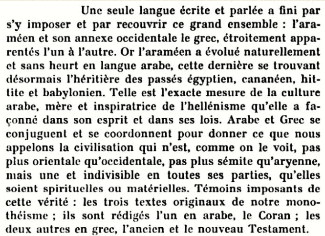 فإذا كانت الحضارة العربية قد امتدت في طرفة عين من البيرينيه إلى أرض السند، فلأنها لم تكن أبداً إقطاعة حفنة من آكلي اليرابيع الذين ارتقوا فجأة . و إذا كان الدين الإسلامي قد انتشر في قارات بكاملها، وإذا كانت اللغة العربية قد لقيت حظاً لم تعرفه أية لغة أخرى، وإذا كانت هي لغة اليهودية والمسيحية و الإسلام فلأن حضارة مهيبة قد أعطتها سلطة تجاوزت أبعاد هضبة الحجاز … و لقد خضع لهذه السلطة اليونان ثم الرومان ومعهم الأتروسكيون قبل أن تنضم إليهم ممالك فيزيقوط الغرب وأمراء الهند.