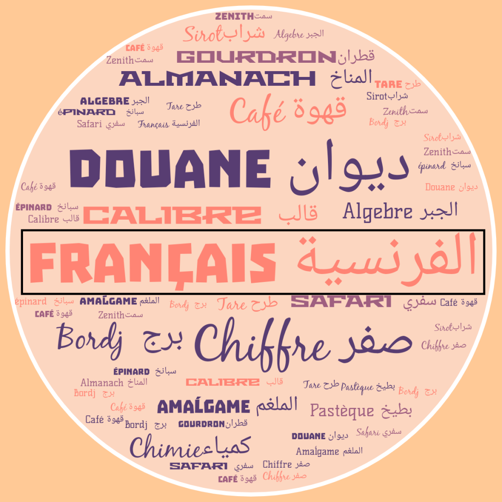 Au petit déjeuner, si vous commandez une tasse de café, avec ou sans sucre et un jus d’orange ou du sirop d’abricot, en vous asseyant sur un sofa ou un matelas, portant votre chemise blanche et votre saroual noir, et en lisant votre magazine préféré sur les algorithmes, la chimie ou les effets de l’alcool sur la santé rapportés par un toubib spécialiste, vous utiliserez déjà une quinzaine de mots français d’origine arabe. Si vous passez ensuite au souk ou au magasin pour acheter de la pastèque ou de l’épinard, avec un peu du cumin, du sumac, du curcuma, du safran, et vous renterez chez vous en bus à un tarif réduit ou en marchant sur le récif ou le goudron, vous en utiliserez encore davantage.