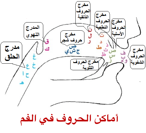 (g) فان مخارج الأصوات العربية تمتد بعده إلى أوسط الحلق فتصدر العين و الحاء، و إلى أقصاه الهمزة و الهاء