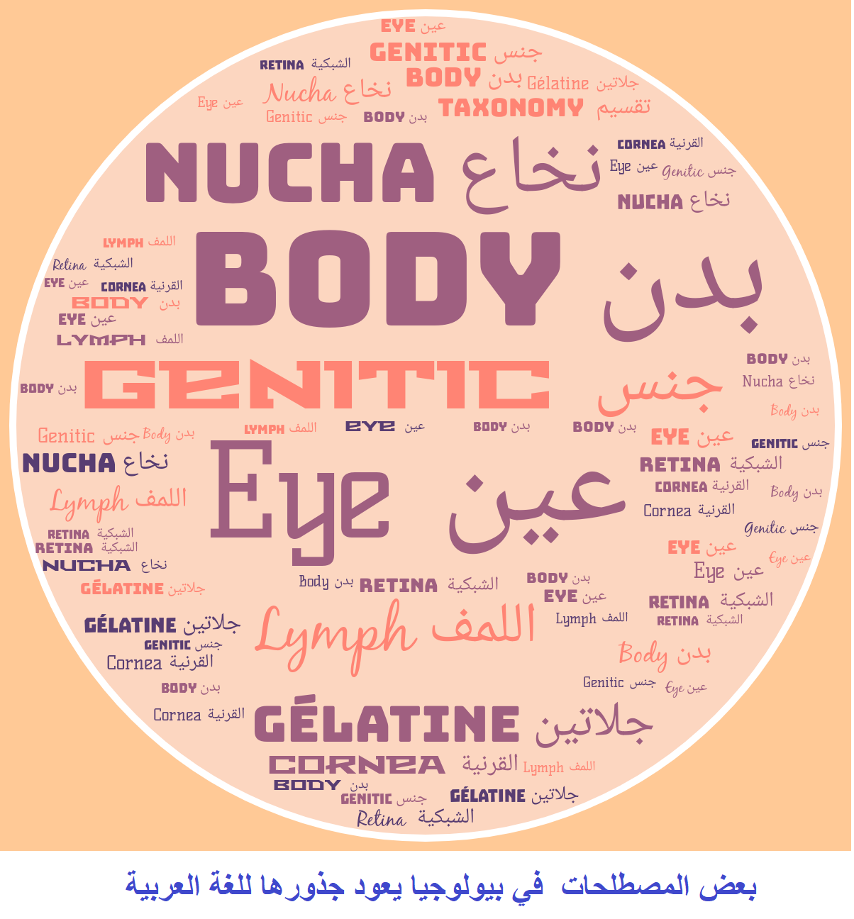 تأثير اللغة والتسمية 5. بعض المصطلحات في بيولوجيا يعود جذورها للغة العربية مستعملة في عديد من لغات العالم جين من جنس Genetic بدن. Body. عين eye نخاع Nucha اللنف أو اللمف Lymph جلاتين gélatine gelatin تقسيم أو تصنيف taxonomy القرنيةُ Cornea الشَّبكية. Retina