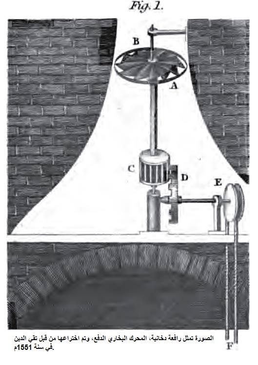 اخترع تقي الدين في عام 1551م (959 هجرية) النموذج البدائي للتوربين البخاري كمحرك أساسي لأول مرذاذ ذاتي الدوران والذي يعمل بقوة البخار، والرافعة الدخانية